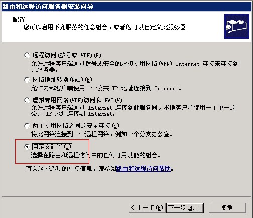 第三步,在“路由和遠(yuǎn)程服務(wù)器安裝向?qū)А敝校x擇“自定義配置”。