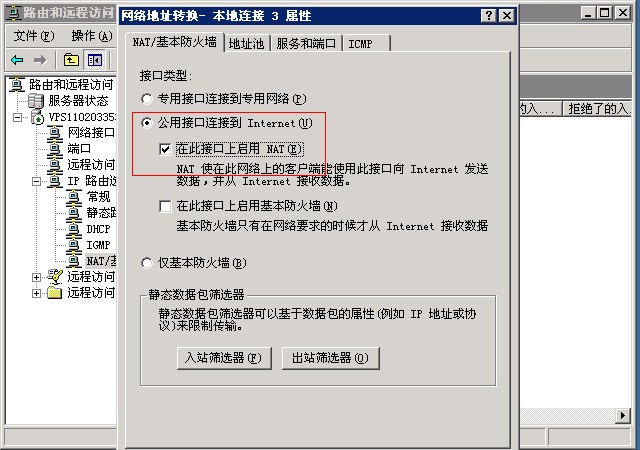第十五步,在彈出的對話框中先點選“公共接口連接到Internet”,再勾選“在此接口上啟用NAT”,最后點擊“確定”。