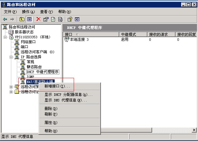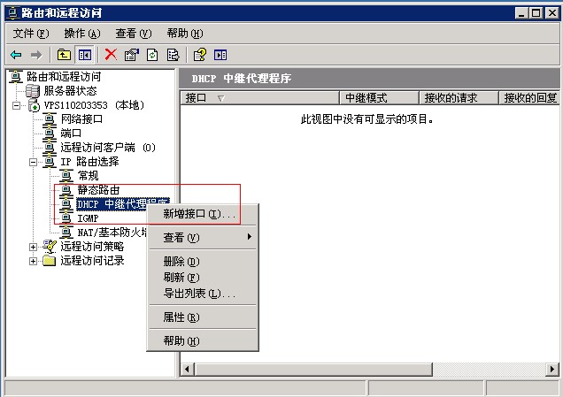第十二步,然后右鍵點擊“DHCP中繼代理程序”,再點擊“新增接口”。