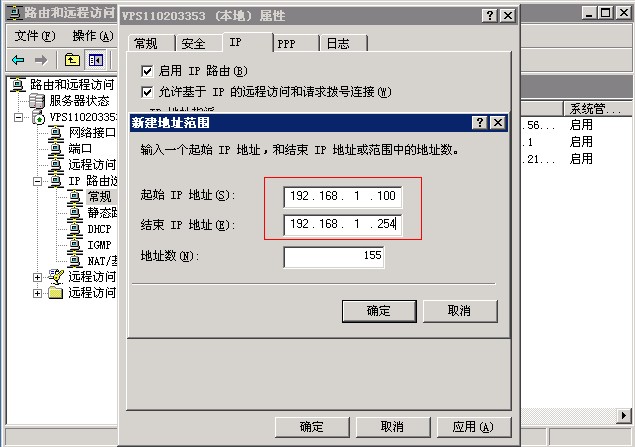 第八步,點選“靜態(tài)地址池”,點擊“添加”。輸入一個起始IP地址和結(jié)束IP地址范圍,推薦輸入192.168.1.100到192.168.1.254這個范圍,因為192.168段屬于本地保留IP段。最后點擊“確定”。