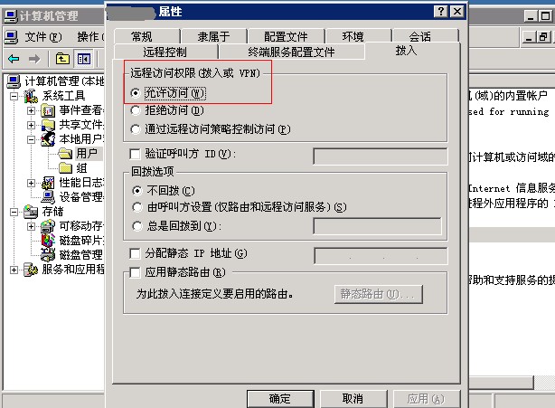 第十六步,至此在路由和遠(yuǎn)程訪問中的配置就完成了。下面是添加VPN用戶的步驟,到計算機(jī)管理中添加一個用戶,作為VPN連接的用戶,把這個用戶放到Guest組下面,并在用戶屬性->撥入->遠(yuǎn)程訪問權(quán)限中設(shè)置成“允許訪問”。 然后就是在你自己電腦上新建VPN連接,進(jìn)行撥號測試了。要確定是否連接成功,請訪問http://www.ip138.com等IP查詢網(wǎng)站,看是否顯示的是國外服務(wù)器的IP即可。